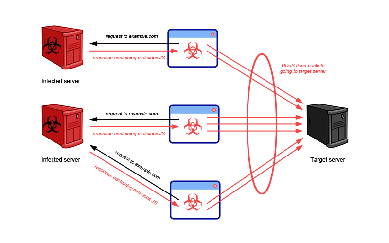 Above situation with Great Firewall of China was a good example of JavaScript-based DDoS triggered by man-in-the-middle attack. Take a look at below drawing showing that method.